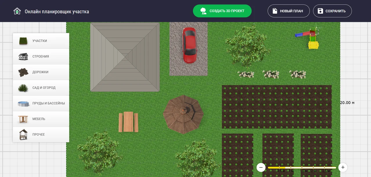 Онлайн-сервис для проектирования чертежей участка. Здесь пользователь создает план любой формы, размещает на нем здания, дорожки, грядки, клумбы, водоемы и малые архитектурные формы. Каталог включает растения, деревья, кустарники, садовую мебель, беседки, детские площадки и даже специализированные значки для овощей и ягод. Каждую деталь можно редактировать, а поверхности — оформлять текстурами: есть трава, плитка, брусчатка и другие.