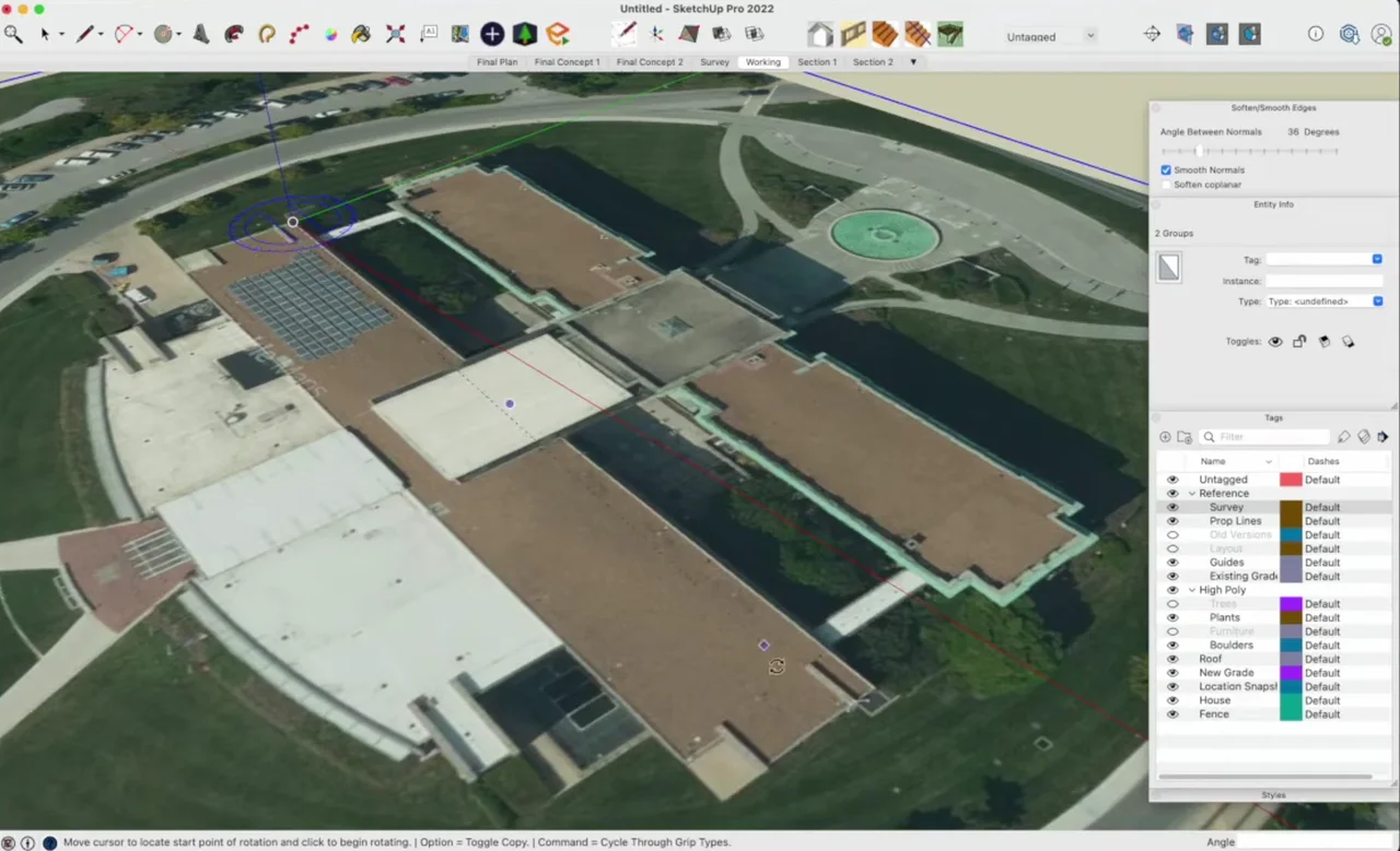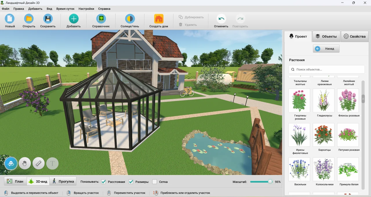 Работа ведется в двухмерном и трехмерном режимах. Пользователь задает границы территории и размещает здания и 3D-объекты из встроенной библиотеки. С ней можно создавать декоративные и хозяйственные зоны, разрабатывать полноценный дендроплан.