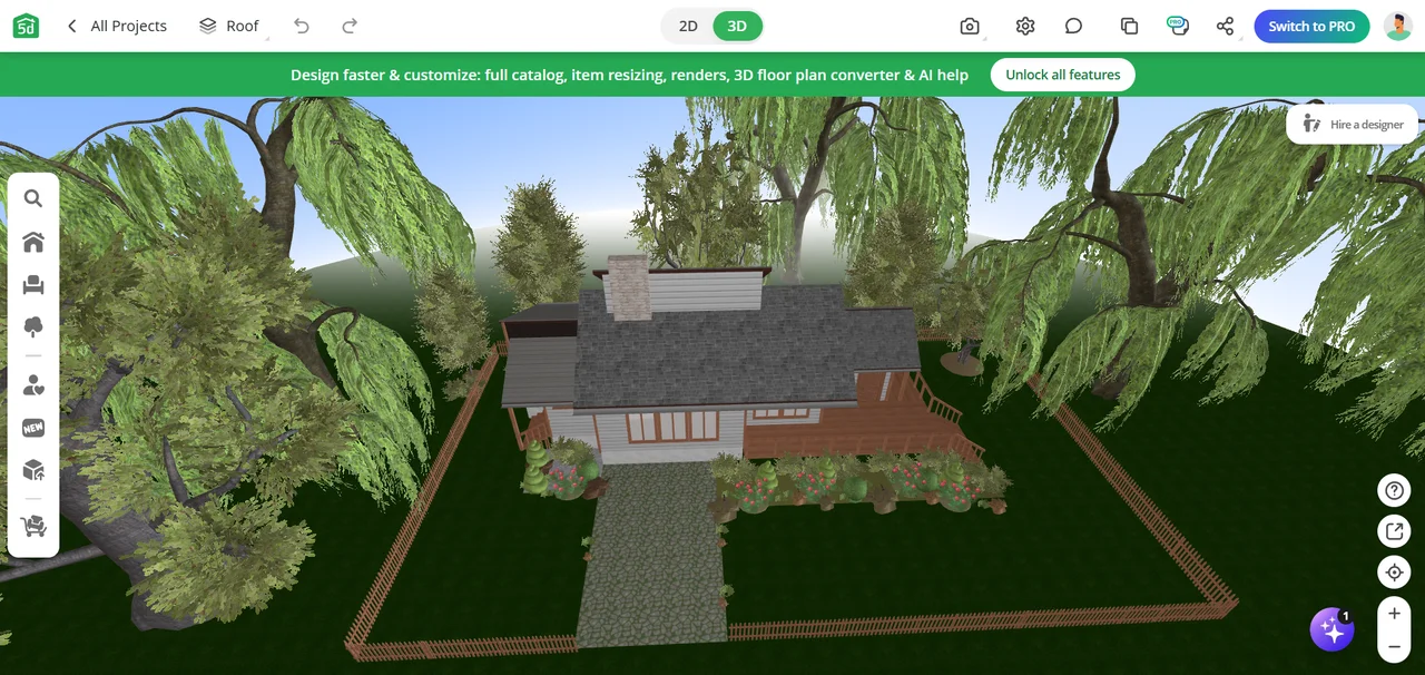 Сервис для проектирования интерьеров, домов и прилегающих территорий. Пользователь создает проект территории с нуля или загружает чертеж, который Planner 5D автоматически преобразует в редактируемую 3D-модель. Библиотека ландшафтных элементов небольшая и рассчитана на планирование небольших палисадников и патио перед домом. Есть функция виртуального обхода и просмотр в VR (в платной версии).