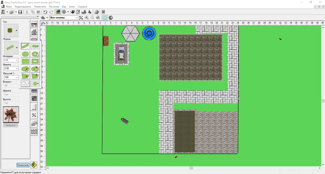 Инструмент позволяет создавать планы участков с размещением ограждений, дорожек, площадок и малых архитектурных форм. Доступна настройка параметров дорожек: формы, ширины и материала покрытия. У растений можно регулировать возраст. Реализована функция свободного моделирования пользовательских объектов на основе базовых примитивов.