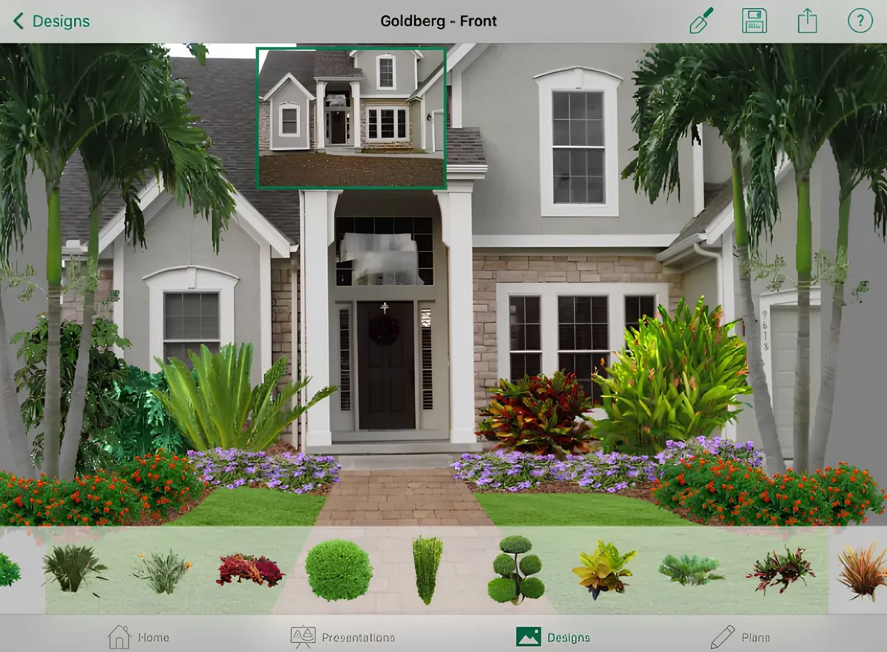 Приложение подключается к облачной библиотеке с более 18 000 растений и элементов благоустройства, включая садовую мебель, уличные кухни, фонтаны и материалы для мощения.